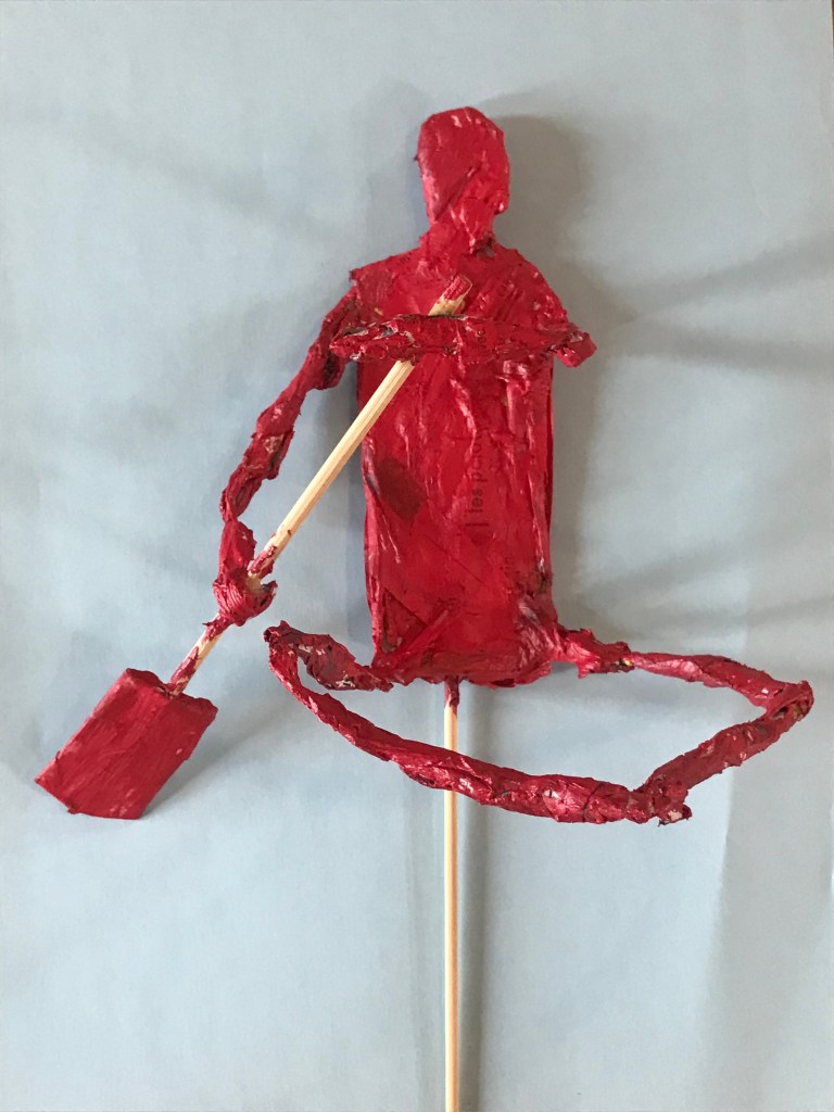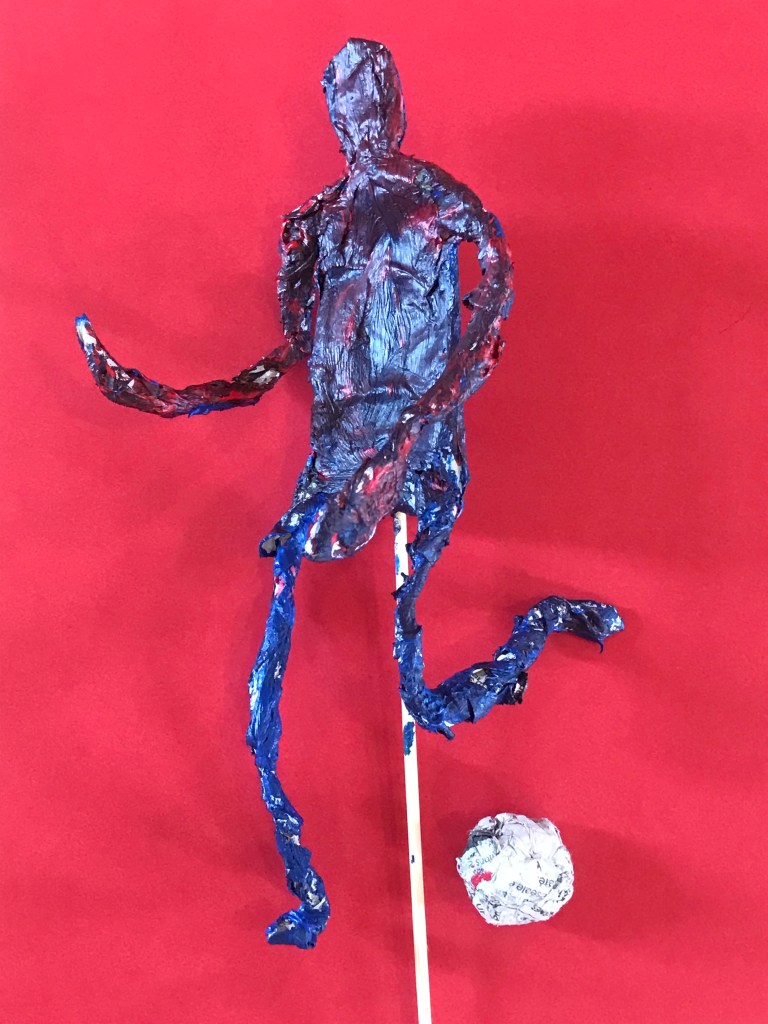 Etude des postures sportives, création de la marionnette en fil de fer, découverte de la tenue d’une marionnette, de la façon dont la faire vivre, puis sculpture et peinture de la marionnette.